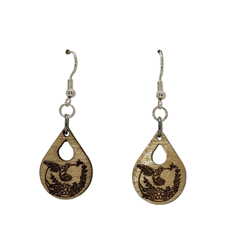 Wooden Hummingbird Earrings: Detailed etching of a hummingbird amidst floral elements. Enhanced by natural wood grain and unique burnt accents. Perfect for casual wear or as a thoughtful gift for nature lovers.
