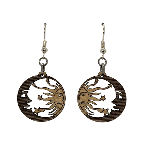 Enchanting Sky: The magic of the Night and Day sky with these stunning wooden earrings, featuring a crescent moon and stars and the sun in an intricate cut-out design. They add a touch of celestial charm to any outfit. A unique, enchanting earrings.