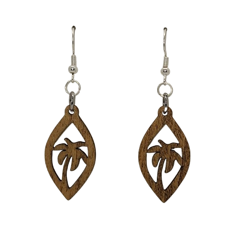 Palm Tree Earrings: Tropical Elegance - These beautiful earrings feature teardrop-shaped wooden pendants with an intricate palm tree cut-out design, perfect for adding a touch of paradise to your style.