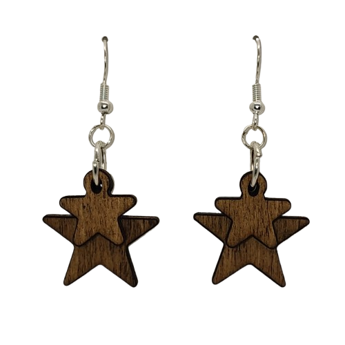 Two Layers Star: These earrings has two stars stacked together, with the largest star at the bottom and the smallest at the top. The stars are made of wood and have a shiny finish, giving them a glamorous and eye-catching appearance.